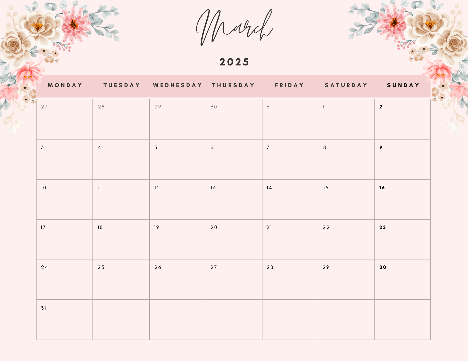 2025 Calendar Light Pink