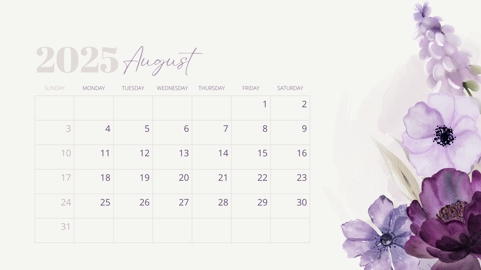 2025 Calendar Purple Flower